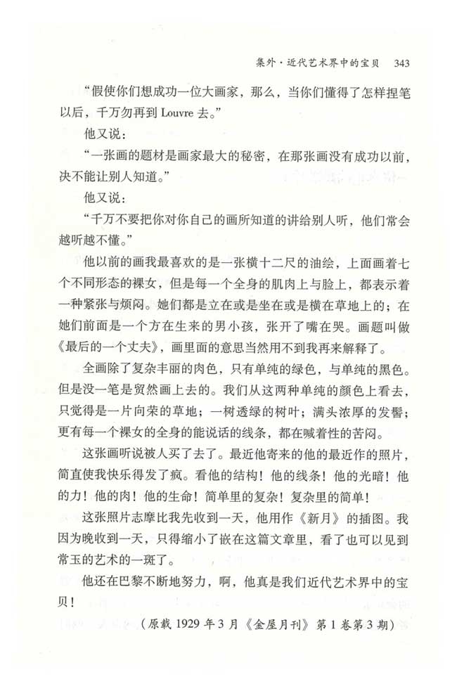 西洋畫在中國雖然有了好幾年歷史,但是幼稚到簡直可笑。有的以為靠了些小聰明便可以生出好畫來,有的以為好畫可以用方式來搭成。比較有些成績的,又都沒有自知之明,偶然被相熟的朋友捧了幾句,竟自列於Michealangelo之流,而藐視一切,因而阻礙了自己進行的步驟。有的又因了環境的關係,而改了行。有的以自己的藝術作消遣的工具,有的以自己的藝術作餓飯時行乞的杖觚。像這樣下去,中國早可以以廢除舊曆的餘力來廢除藝術了。