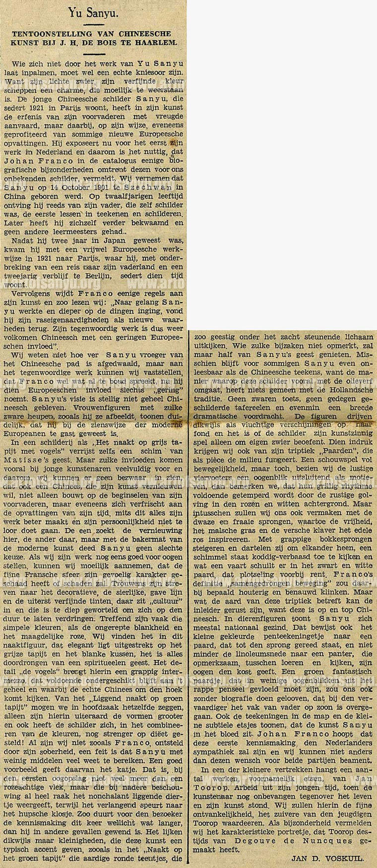 Vervolgens wijdt Franco eenige regels aan zijn kunst en zoo lezen wij: “Naar gelang Sanyu werkte en dieper op de dingen inging, vond hij zijn raseigenaardigheden als nieuwe waarheden terug. Zijn tegenwoordig werk is dus weer volkomen Chineesch met een geringen Europeeschen invloed”.