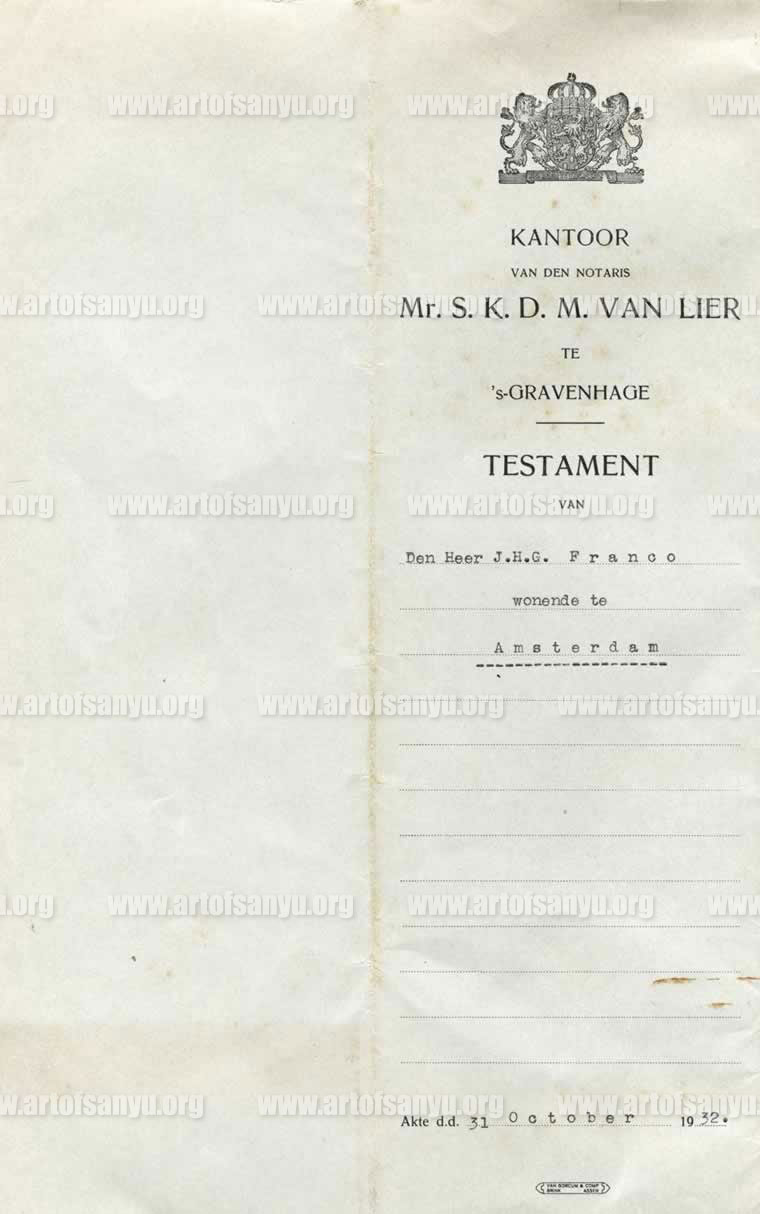 Voorts legateer ik vrij van rechten en kosten aan den Heer Yu Sanyu, geboren te Szechuan (China) op veertien October negentien honderd een, thans wonende te Parijs, een levenslange lijfrente, groot vijf honderd gulden per drie maanden, uit te keeren voor het eerst drie maanden na mijn overlijden.