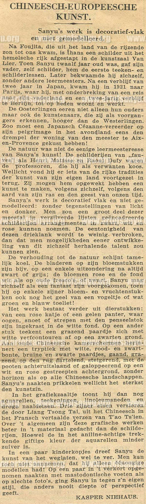 Na Foujita, die uit het land van de rijzende zon tot ons kwam, is thans een schilder uit het hemelsche rijk afgestapt in de kunstzaal Van Lier. Toen Sanyu twaalf jaar oud was, gaf zijn vader, zelf schilder, hem de eerste teeken — en schilderlessen. Later bekwaamde hij zichzelf, zonder andere leermeesters. Na een verblijf van twee jaar in Japan, kwam hij in 1921 naar Parijs, waar hij, met onderbreking van een reis naar zijn vaderland en een twee-jarig verblijf te Berlijn, tot op heden woont en werkt.